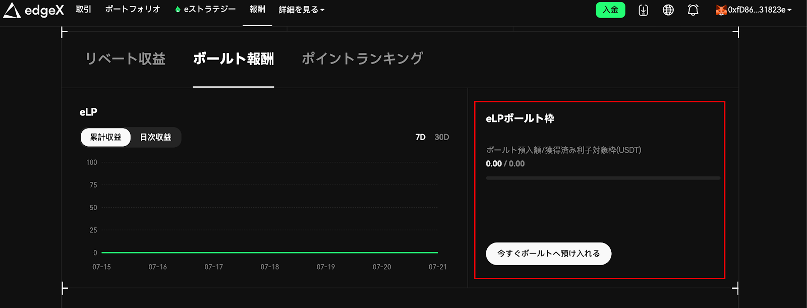 左側の累計収益グラフで、Vaultを通じて獲得した累計収益を確認できます。右上のボタンで表示期間を切り替え可能(7日間/30日間)。