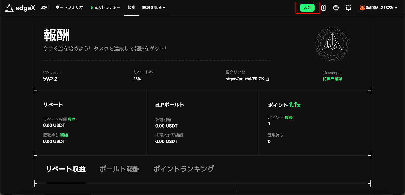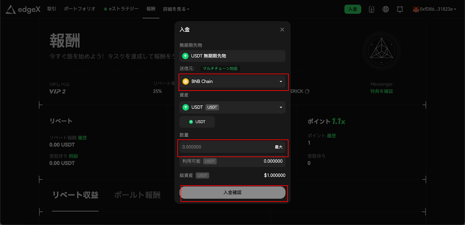 edgeXの入金額が100USDT以上の場合、ポイントを獲得するチャンスがあります。今後のエアドロップを狙っている方は、ぜひ100USDT以上を入金しておきましょう。