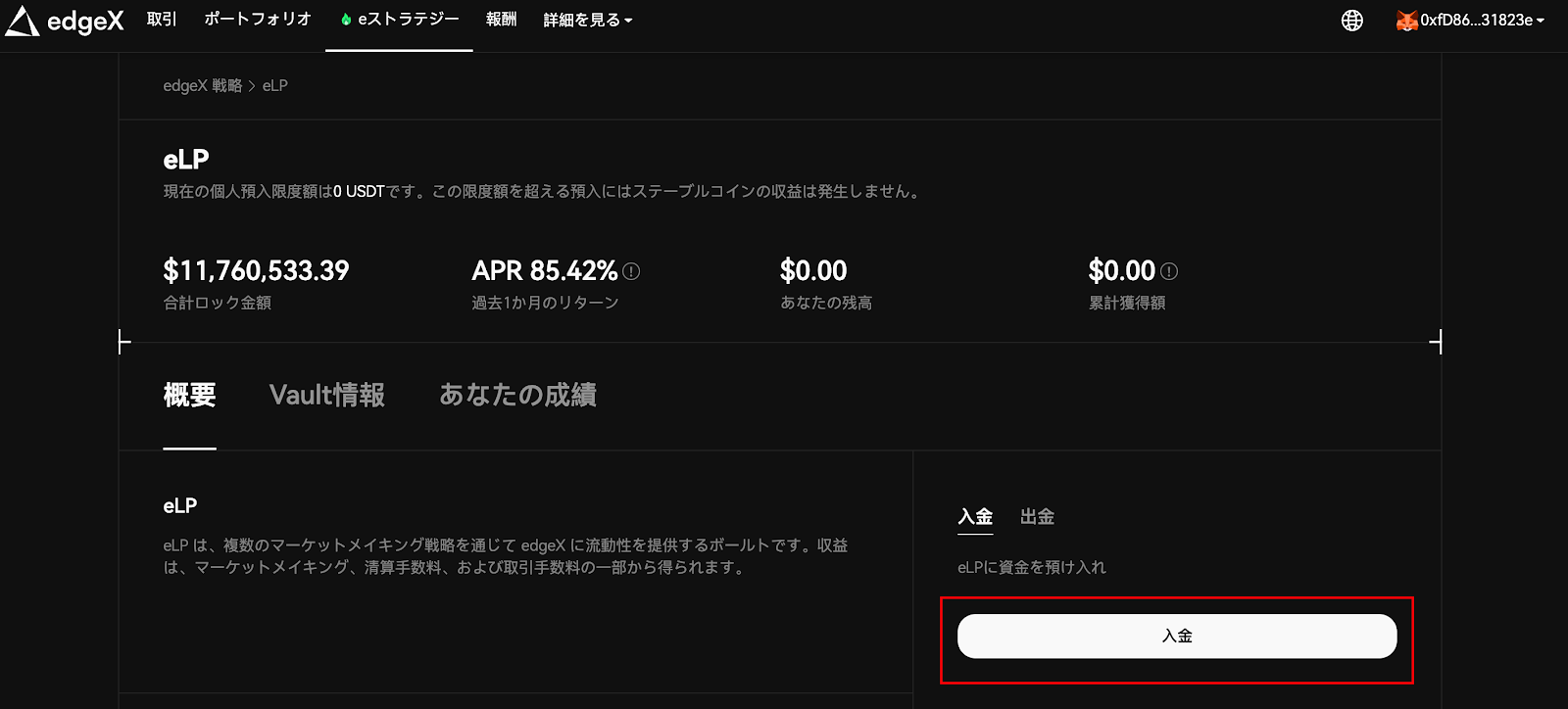 Vaultホームページを開き、「預入」ボタンをクリックしてVaultに預け入れます。